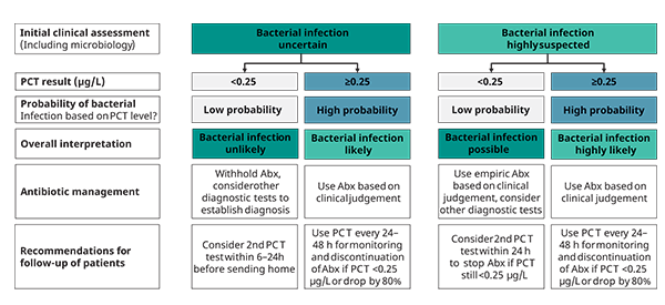 A recent consensus paper by Schuetz et al. offers recommendations on antibiotic management of patients in ED and ICU based on clinical severity, probability of bacterial infection and PCT levels. See figures 1 - 3 [1].