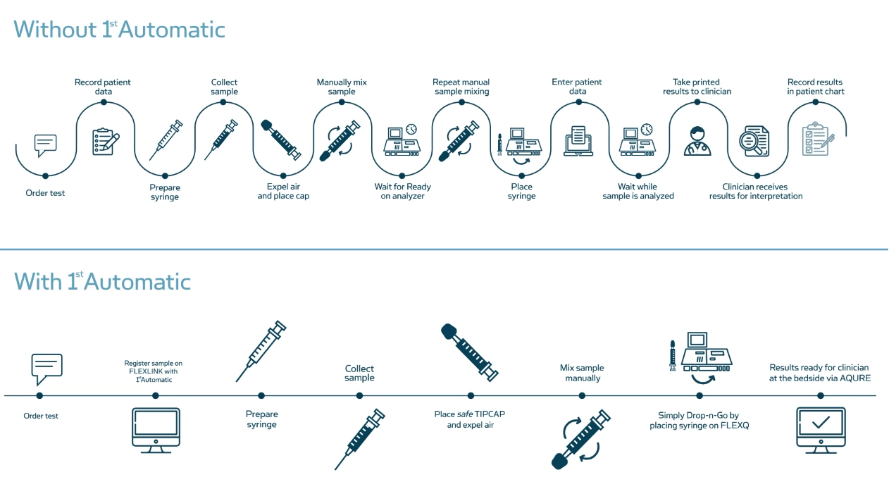 Combine your ABL800 FLEX and safePICO syringes with AQURE's FLEXLINK system to utilize 1st Automatic. The connected solution registers patient, operator and sample IDs at the bedside, while FLEXLINK links these data together. An example of how it could expedite your workflow is shown below.