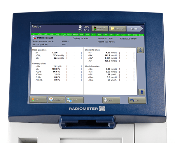 19 paramètres rapides – y compris les gaz du sang, les métabolites, les électrolytes, l’hémoglobine et les paramètres rénaux. Cela est mesuré sur l’analyseur de gaz du sang ABL90 FLEX PLUS à partir d’un échantillon, fournissant tous les résultats en 35 secondes avec 65 μl de sang. Voici la liste complète des paramètres mesurés :